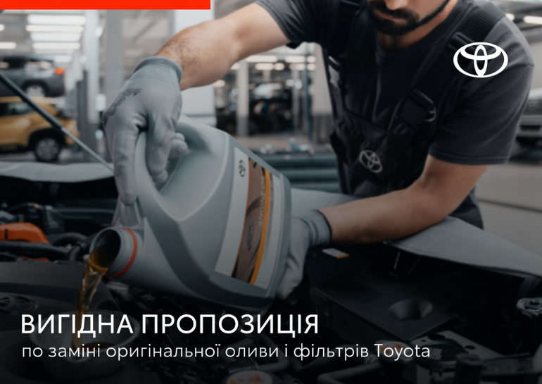 * В пакетну пропозицію по заміні моторного масла входить такий перелік матеріалів та послуг: масло Toyota 5W-30 Premium Fuel Economy, ущільнююча прокладка, масляний фільтр, фіксована вартість на роботи по заміні масла. Зазначена пакетна пропозиція діє виключно на пост-гарантійні автомобілі Toyota та діє з 1 липня до 31 грудня 2025 року на СТО ТОВ «ВІДІ Автострада» за адресою: вул. Велика Кільцева, 56, с. Софіївська Борщагівка, Київська обл., Україна.